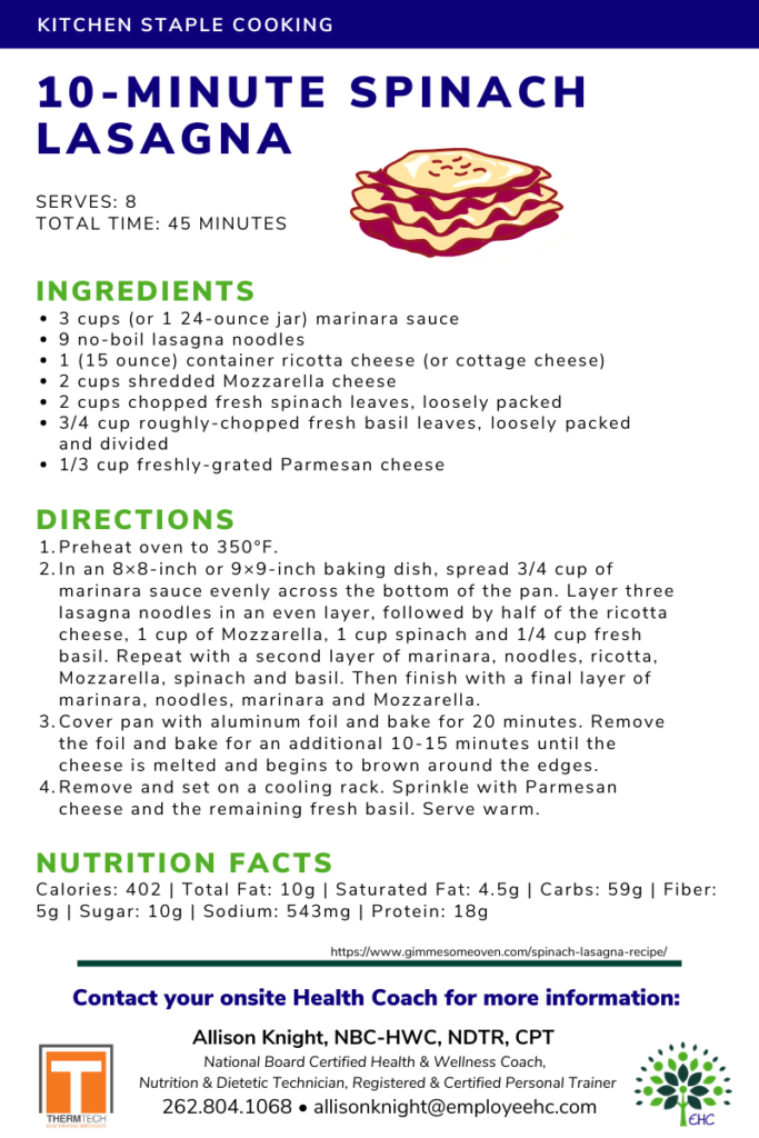 Kitchen Staple Cooking: 10-Minute Spinach Lasagna Whip this up in less than an hour and serve with a salad for a complete meal. Make a double batch or freeze leftover for later use! Source